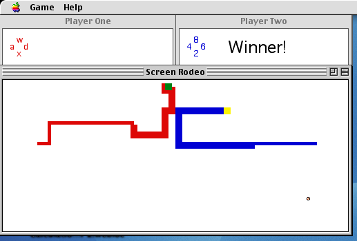 . . . Screen Rodeo was inspired by the Atari 2600 masterpiece, Surround! Your playing piece, an elegantly-colored blip, emits a trail composed of some lethal substance (possibly molten rock or cigarette smoke.) You are free to roam the playing field using the displayed keyboard controls, with one important restriction.